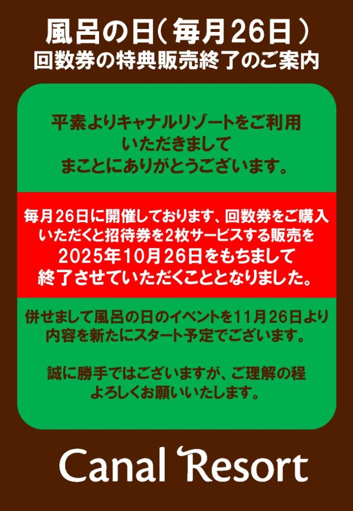 毎月26日に実施しております、風呂の日イベントにて回数券をご購入いただくと